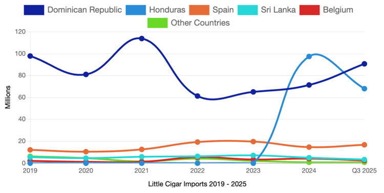 Little cigar imports continue to stand out as a bright spot in the import landscape. Through September 2025, little cigar imports increased 26.0% year to date, with growth spread across filtered and machine-made, 100% tobacco products. The Dominican Republic remains the leading source of increased shipments, followed by Honduras and Spain.